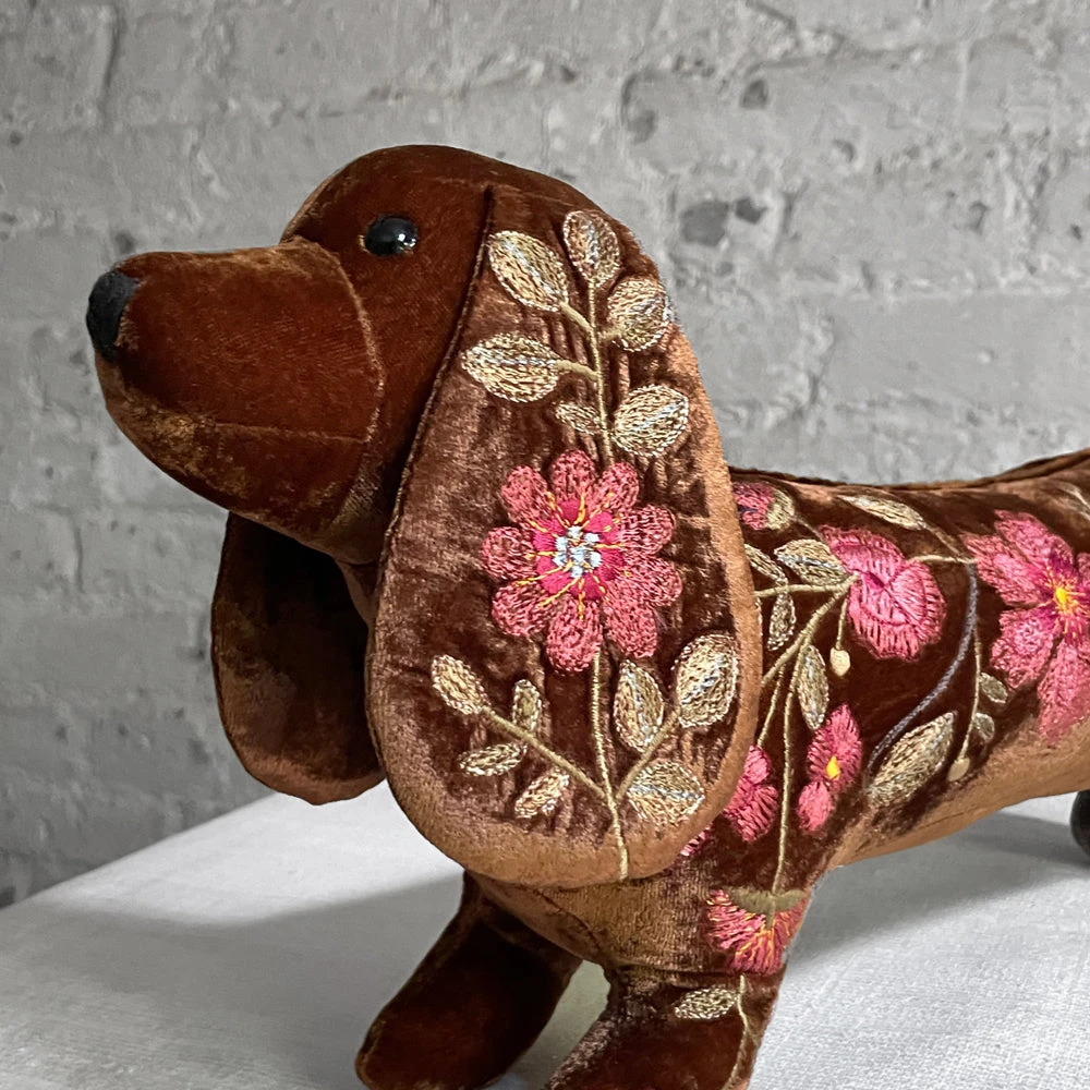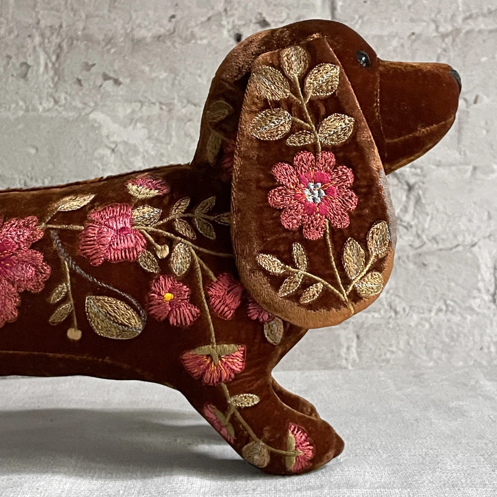 Anke Drechsel Anke Drechsel Embroidered Animals Megan Silk Velvet Dachshund In Cognac