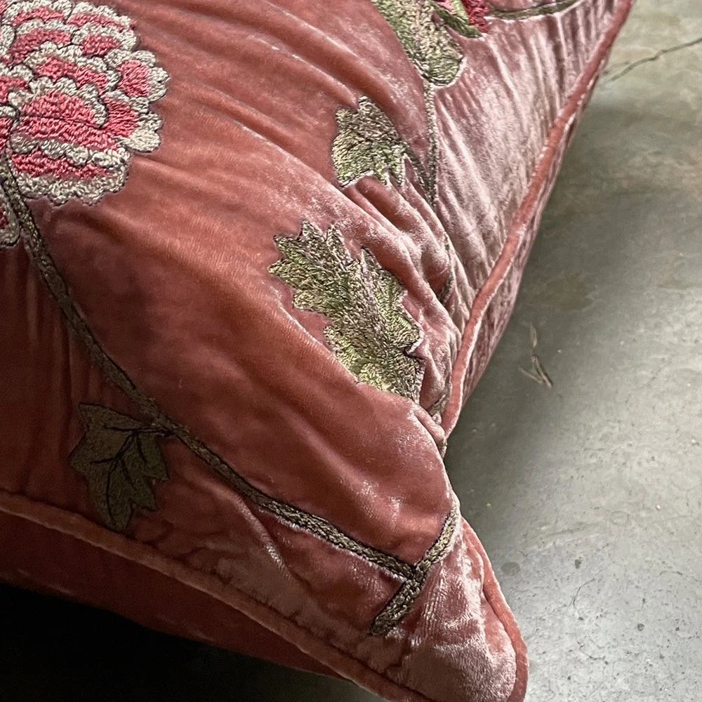 Anke Drechsel’s silk and silk velvet pillows and blankets stand out due to their lush materials, colors and patterns. Her master craftsmen use both fine hand embroidery and small hand-guided machines to achieve her intricate and visually stunning designs.