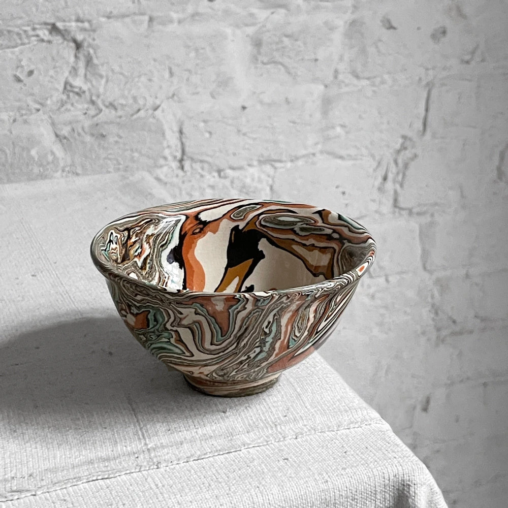 Sylvie Saint-Andre Perrin achieves the marble effect of her line of ceramics by a process called stamping. Each color of clay is created by mixing in various oxides that are then swirled and shaped using plaster molds.