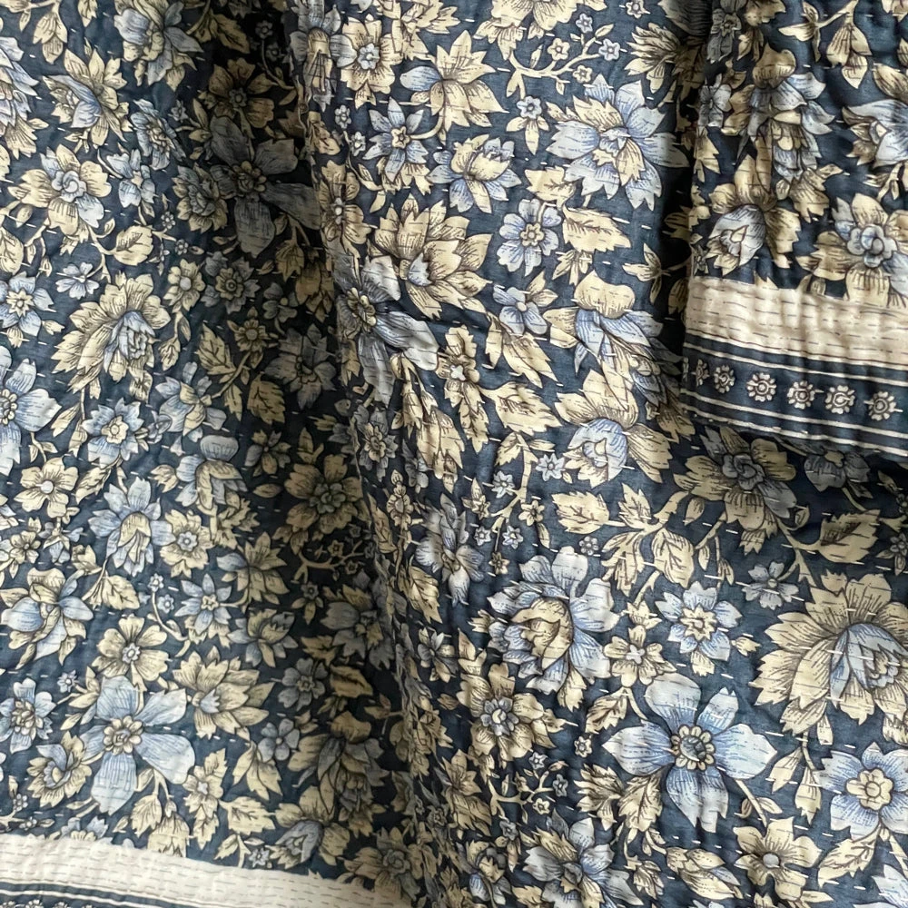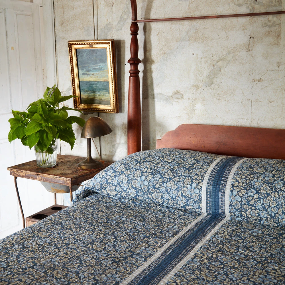 An avid collector of vintage fabrics and patterns, Jeanette Farrier, who had a long and celebrated career as a costume designer, has spent many years traveling from her London home to India to grow her trove. Now, with the help of the same women’s collective in Mayurhat, India, who she’s employed for over 15 years to transform her vintage cotton saris into a line of kantha pillows and blankets, Farrier is introducing a collection of quilted bedcovers with prints culled from her vast archives. The lovingly handmade bed covers are the ultimate modern heirloom.
