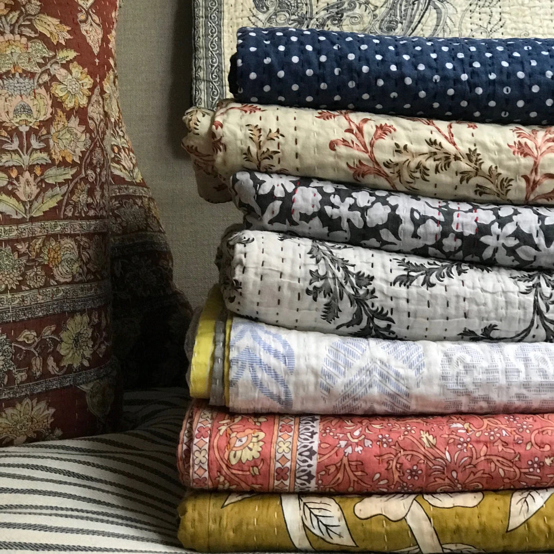 An avid collector of vintage fabrics and patterns Jeanette Farrier, who had a long and celebrated career as a costume designer, has spent many years traveling from her London home to India to grow her trove. Now, with the help of the same women’s collective in Mayurhat, India, who she’s employed for over 15 years to transform her vintage cotton saris into a line of kantha pillows and blankets, Farrier is introducing a collection of quilted bedcovers with prints culled from her vast archives. The lovingly handmade bed covers are the ultimate modern heirloom.
