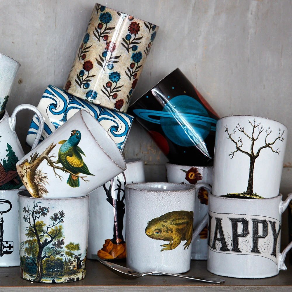 John Derian teamed up with Astier de Villatte to add his iconic imagery to their classic white tableware. The 19th-century inspired patterns and images perfectly complement the handmade ceramics. Learn more about Astier de Villatte here.