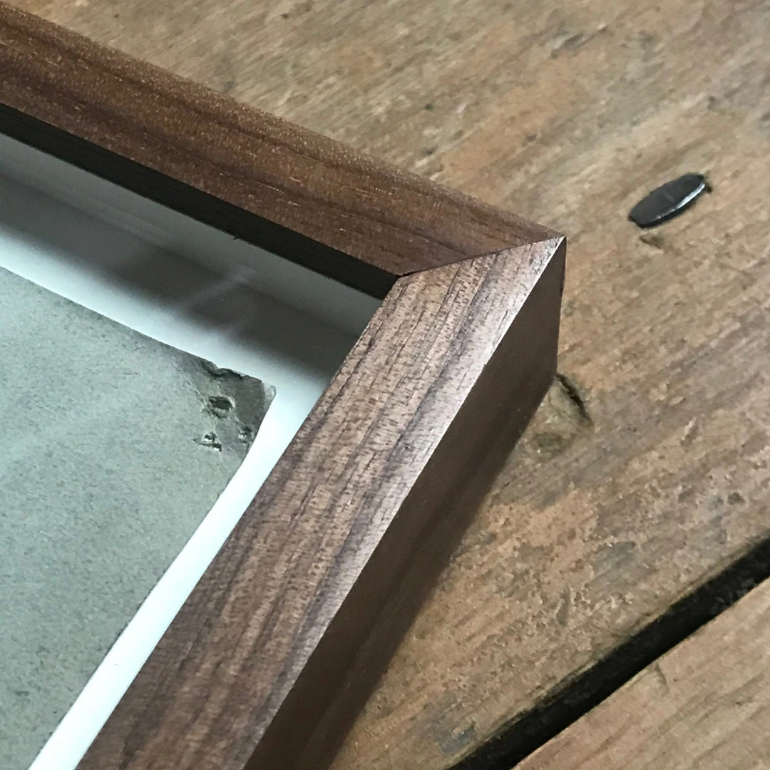 Framed pieces are floated in a natural wood frame with UV resistant plexiglass.